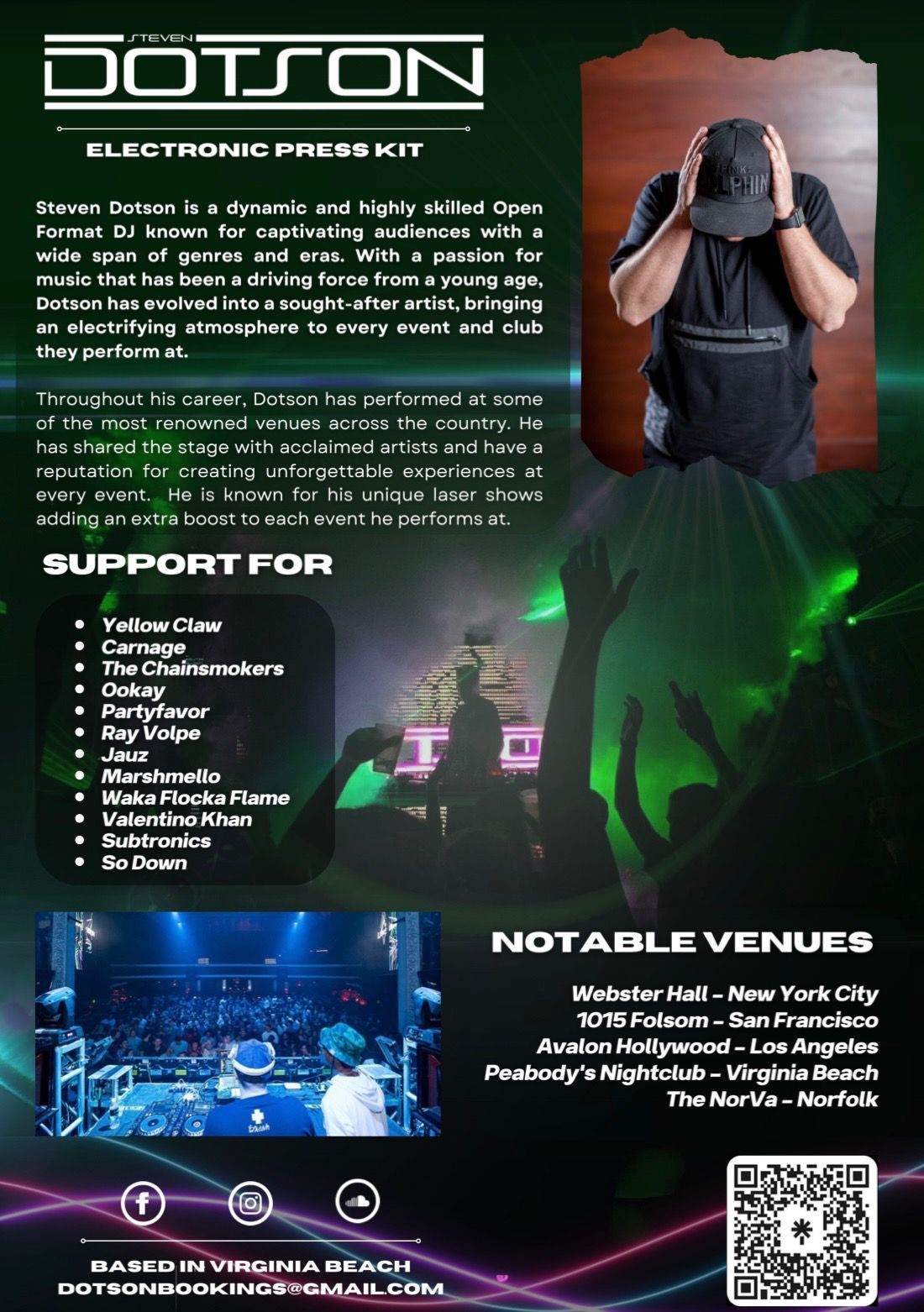 Contact Steven Dotson for booking or further information by emailing Steven@dotsonent.com